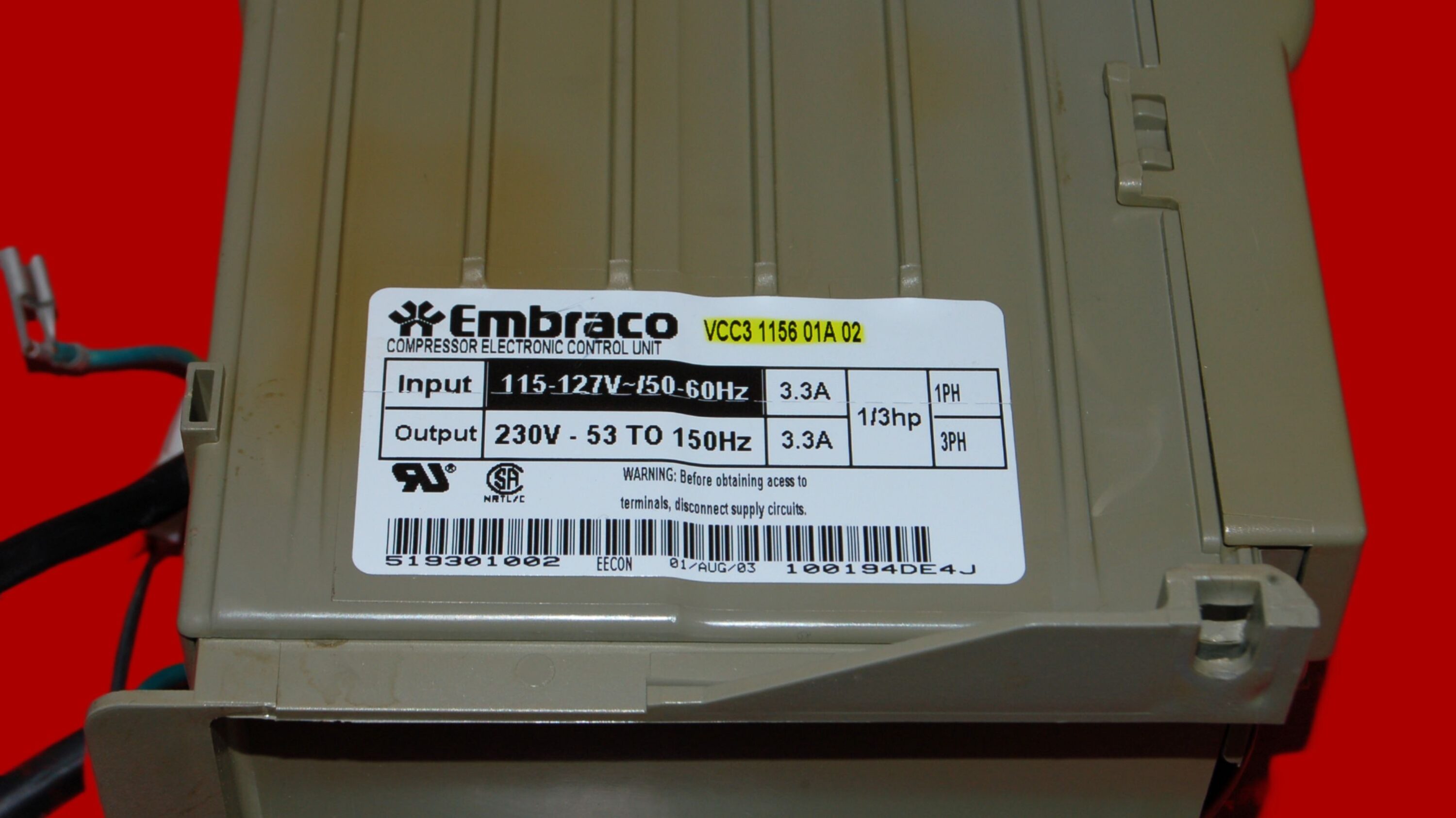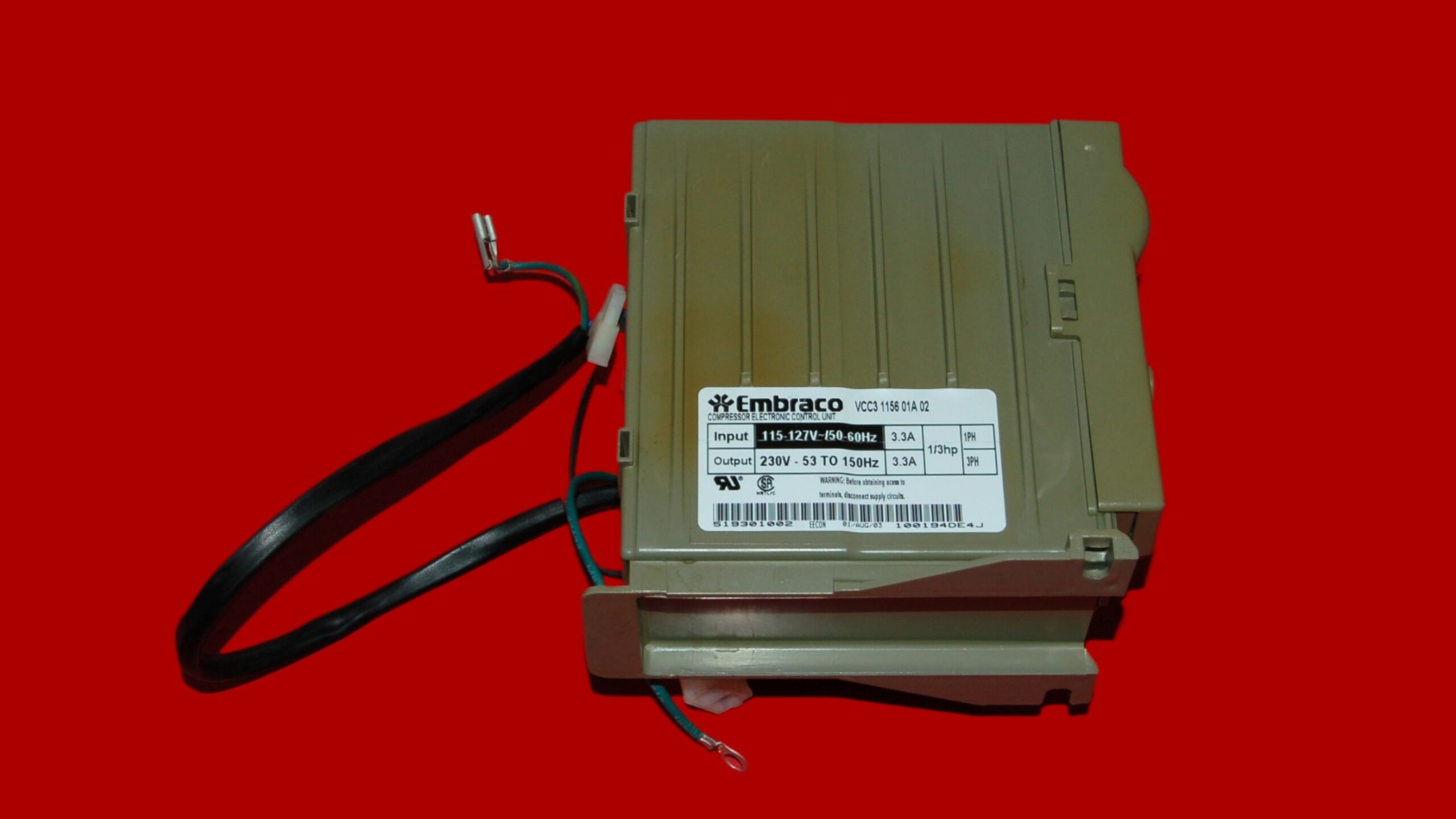 Used in select GE refrigerators with Embraco variable-speed compressors.